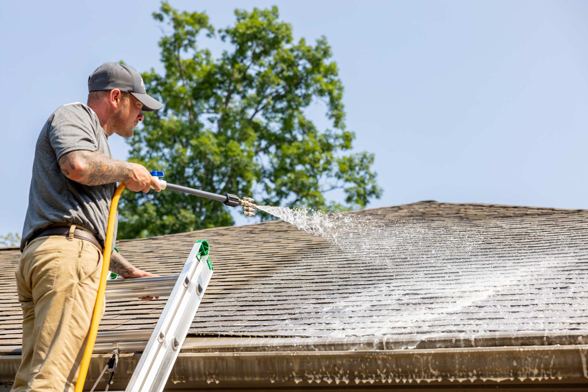 We do not use high pressure on house siding or roof shingles because it can damage them. Instead, our house wash and roof wash services involve a “soft wash” which is a low-pressure cleaning that relies on our custom blend of detergents to do the work. We do use appropriately adjusted higher pressure to clean brick, concrete, stone, decks, patios, and fences. Our technicians are thoroughly trained and know when high pressure is safe to use and when it isn’t.